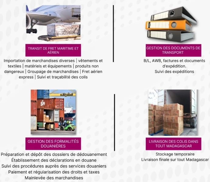 1. Le Choix : Sélectionnez le produit ou la marchandise souhaitée, partout dans le monde. 2. Le Fret : Nous organisons le transport adapté à vos besoins, en aérien ou maritime. 3. La Douane : Notre équipe s’occupe de toutes les formalités douanières et administratives. 4. La Livraison : Récupérez vos colis ou profitez d’une livraison à domicile, partout à Madagascar.